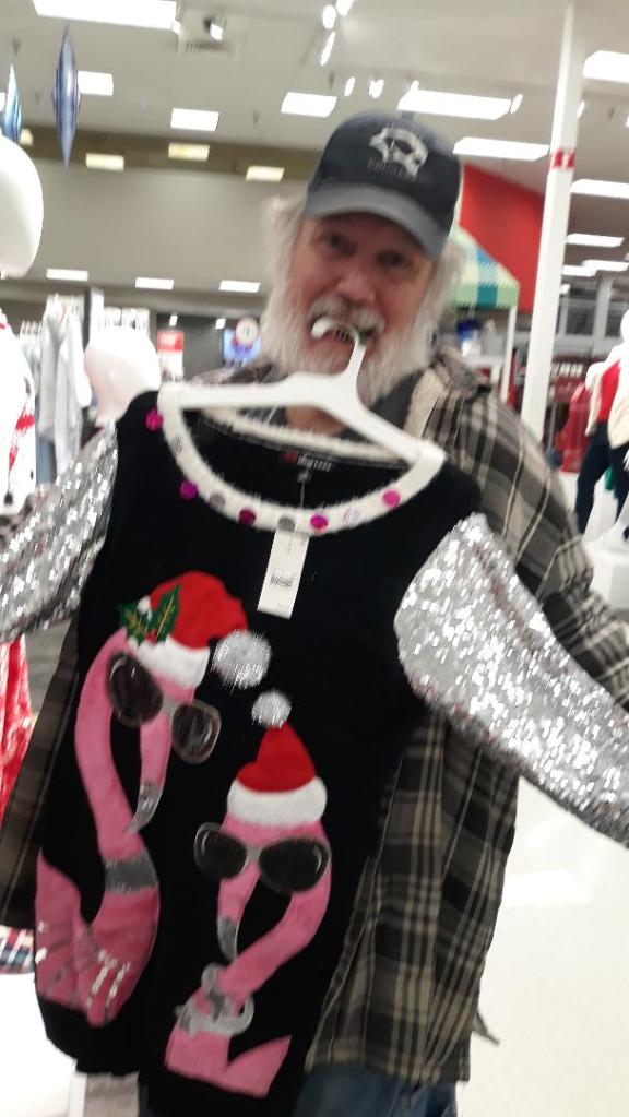 This picture is of my husband Tim, when we were in Target, looking at Christmas Sweaters. He did this so I could see the approxomite size, as I was looking at a sweater for a friend. He does love Christmas, but he doesn’t like the stress that often accompanies this famous holiday. Who does?